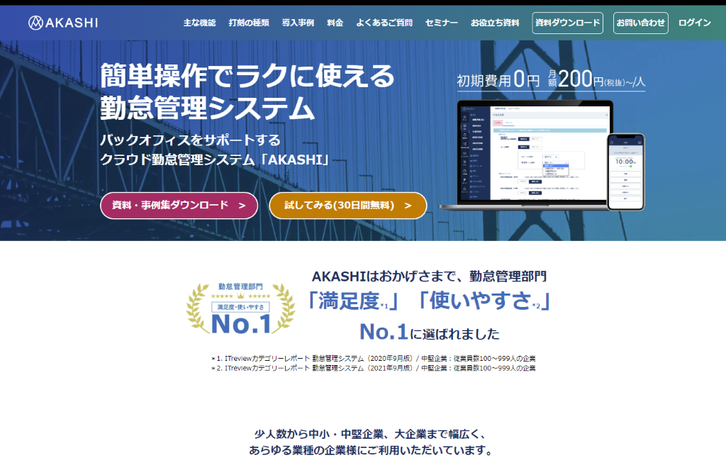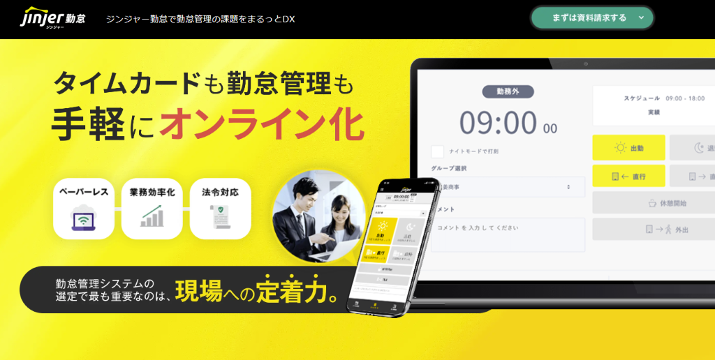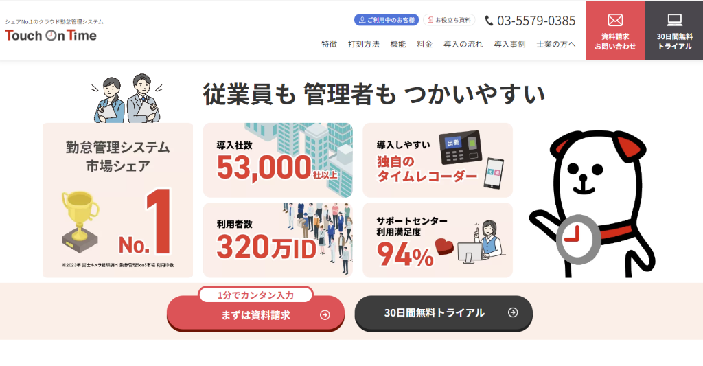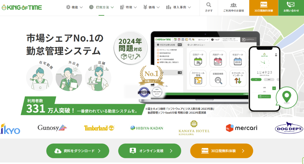 勤怠管理における、経営者の悩み、人事の悩み、現場の悩みを三方良しで解決するツールです。専任サポート担当が付くため、高いシステム利用定着率を維持することができます。また、働き方に合わせて打刻方法を柔軟に選べるのもメリットです。