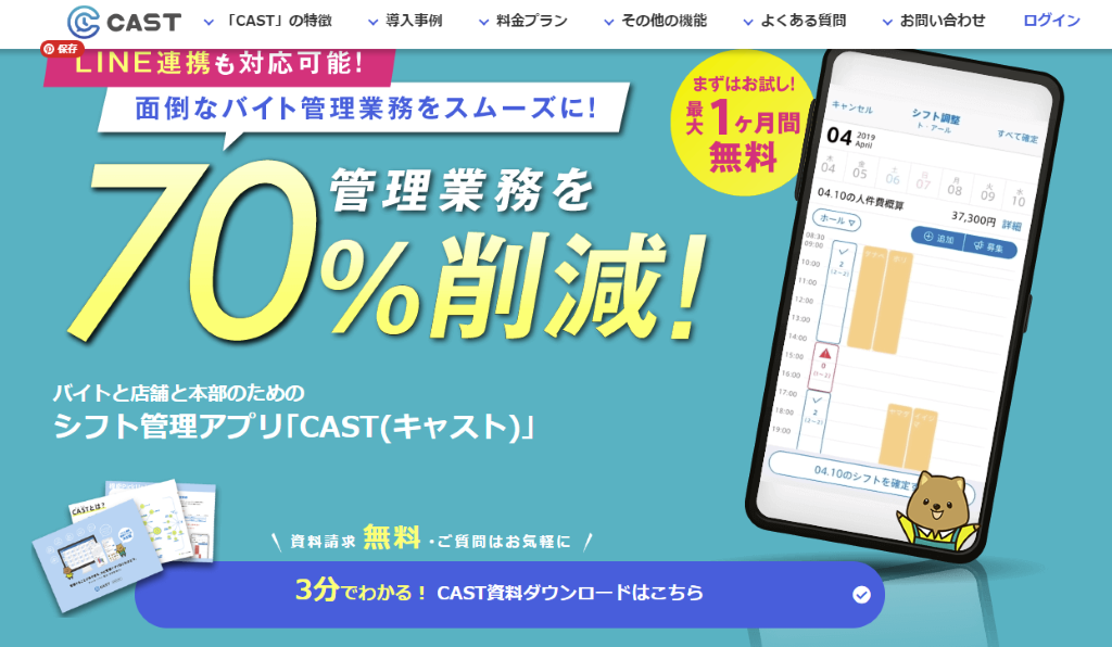 CASTはLINE連携が可能な勤怠管理ツールです。シフトの自動収集、シフト提出催促・周知、人件費の管理、労働時間の管理等の機能が集約されており、勤怠管理業務を大幅に削減することが可能。独自のチャット機能が付いているので、公私混同を防げるのもメリットです。
