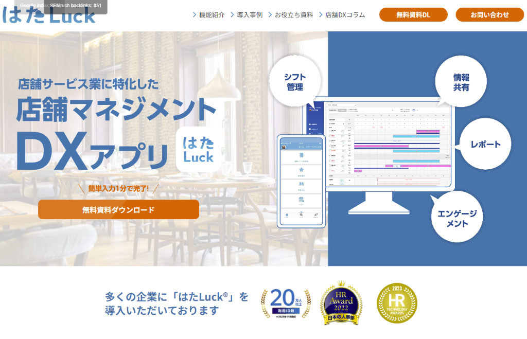 はたluckは店舗内のスムーズな情報共有の実現や、従業員の満足度を向上させるのに貢献する勤怠管理ツールです。情報共有機能、シフト作成機能の他にエンゲージメント機能やレポート機能も付いています。アフターフォローが付いているのも魅力のひとつです。