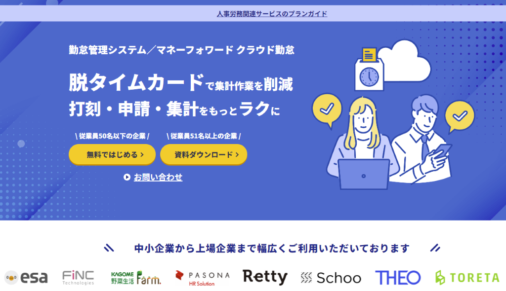 少人数企業から大企業まで、幅広く導入実績を持つ勤怠管理ツールです。プランは3つ用意されており、ニーズに合わせて選択できます。また、就業規則・労使協定設定や36協定設定、年休管理簿などの機能が付いており、他社サービスとの連携も可能です。