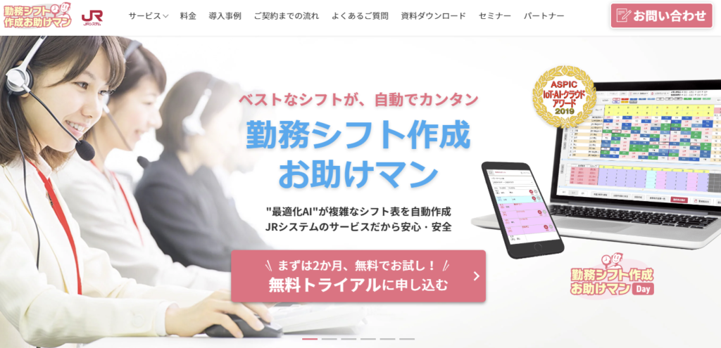 「勤務シフト作成お助けマン」はシフト表の自動作成・管理ができるクラウドサービスです。スタッフの勤務希望や条件を考慮してシフト表を自動作成する「勤務シフト作成お助けマン Day」と勤務時間を割り当てるシフト表を自動作成する「勤務シフト作成お助けマン Time」の二種類が用意されています。JR「みどりの窓口」を支える技術を駆使しており、セキュリティ性が高いのも特徴です。