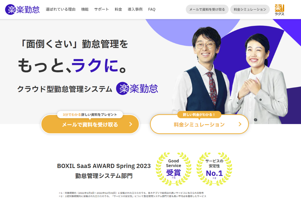 様々な打刻手段を備えているのが特徴の勤怠管理ツールです。PCでの打刻、顔認証や指紋認証などの生体認証やICカードによる打刻が可能。また、機能が充実しているので複雑な要望にも応えることができます。直感的に使用できるUIを採用しており、初めての方でも使用しやすいのもメリットです。
