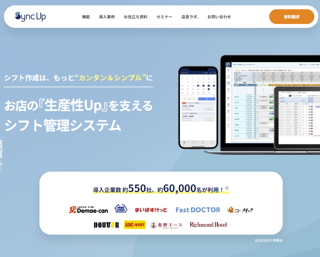 シンオプは、人出不足対策・シフト管理の効率化といった課題を解決するためのシフト作成・管理システムです。利用ユーザーは80,000人を突破しており、やよい軒やHotto Mottoなど多くの飲食店に導入実績があります。導入することで「シフト管理工数が72%削減された」「ヘルプ活用による稼働率112%アップを実現した」といったメリットを享受できる勤怠管理ツールです。