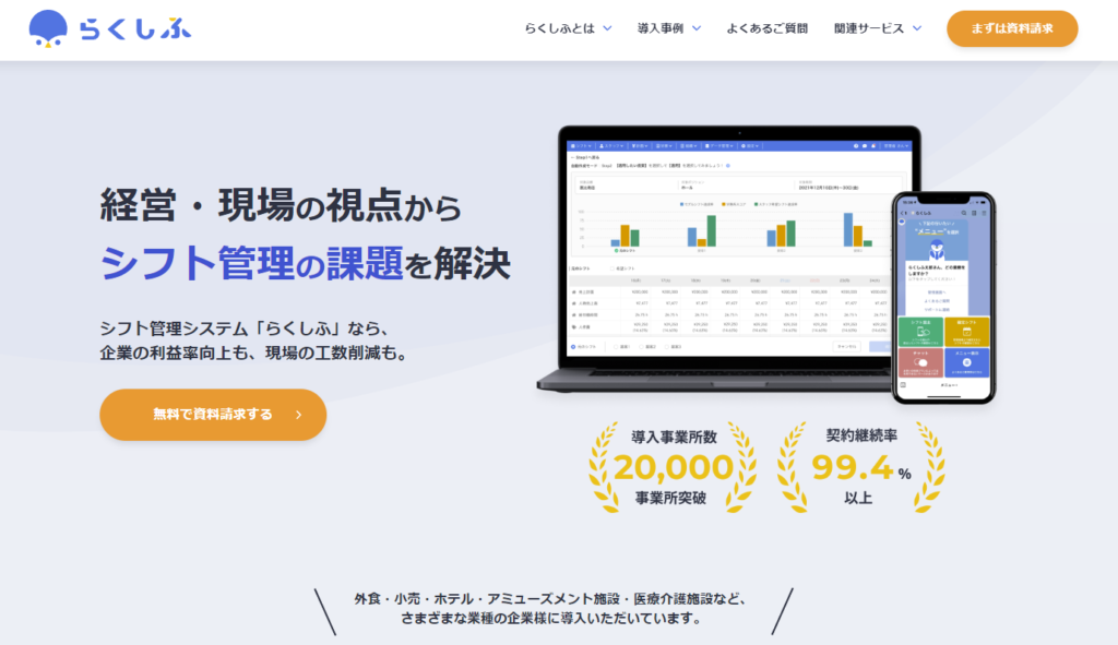 スタッフの最適配置実現や、ヘルプ機能によるリソースの創出などに貢献する勤怠管理ツールです。外食・小売・ホテル・アミューズメント施設・医療介護施設など、